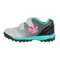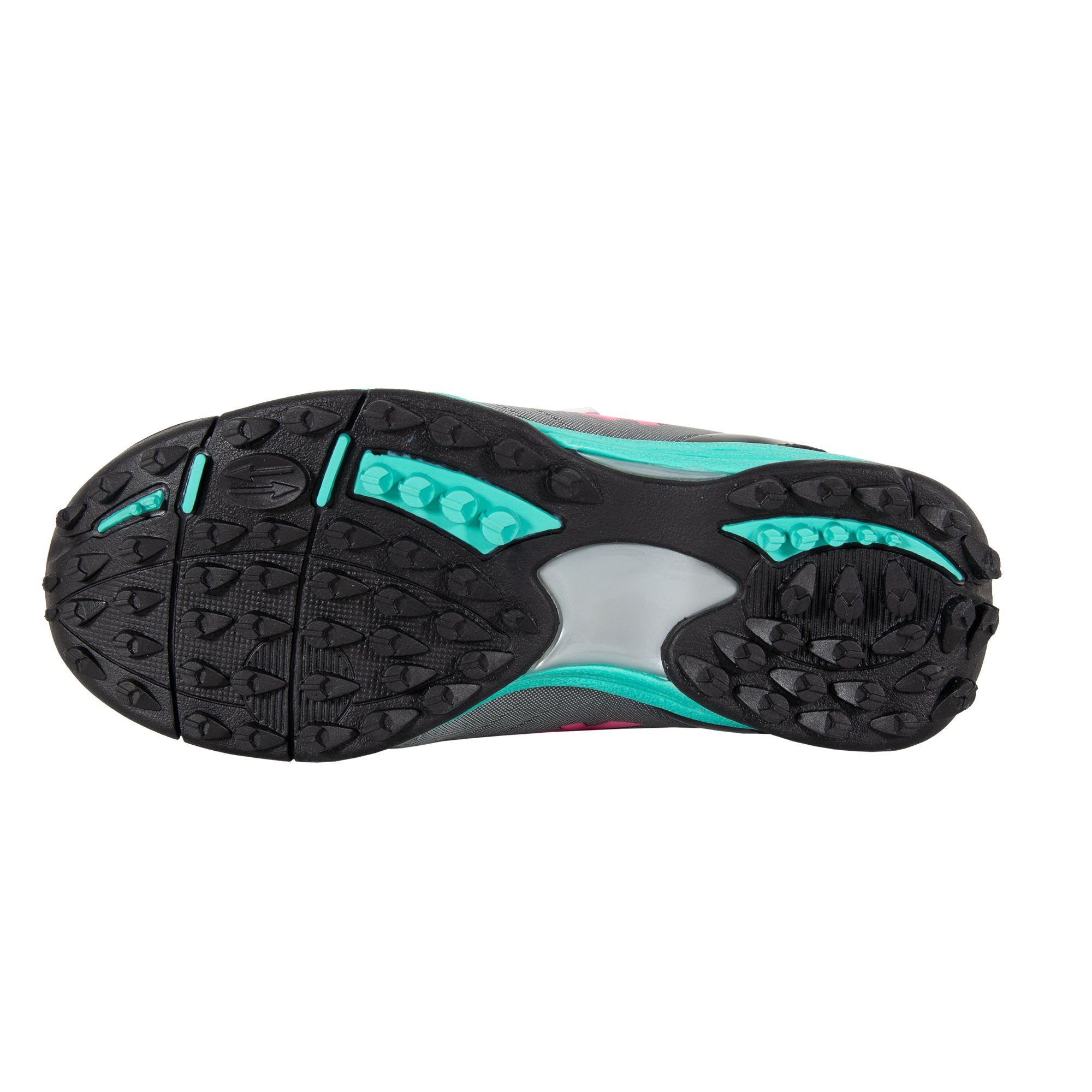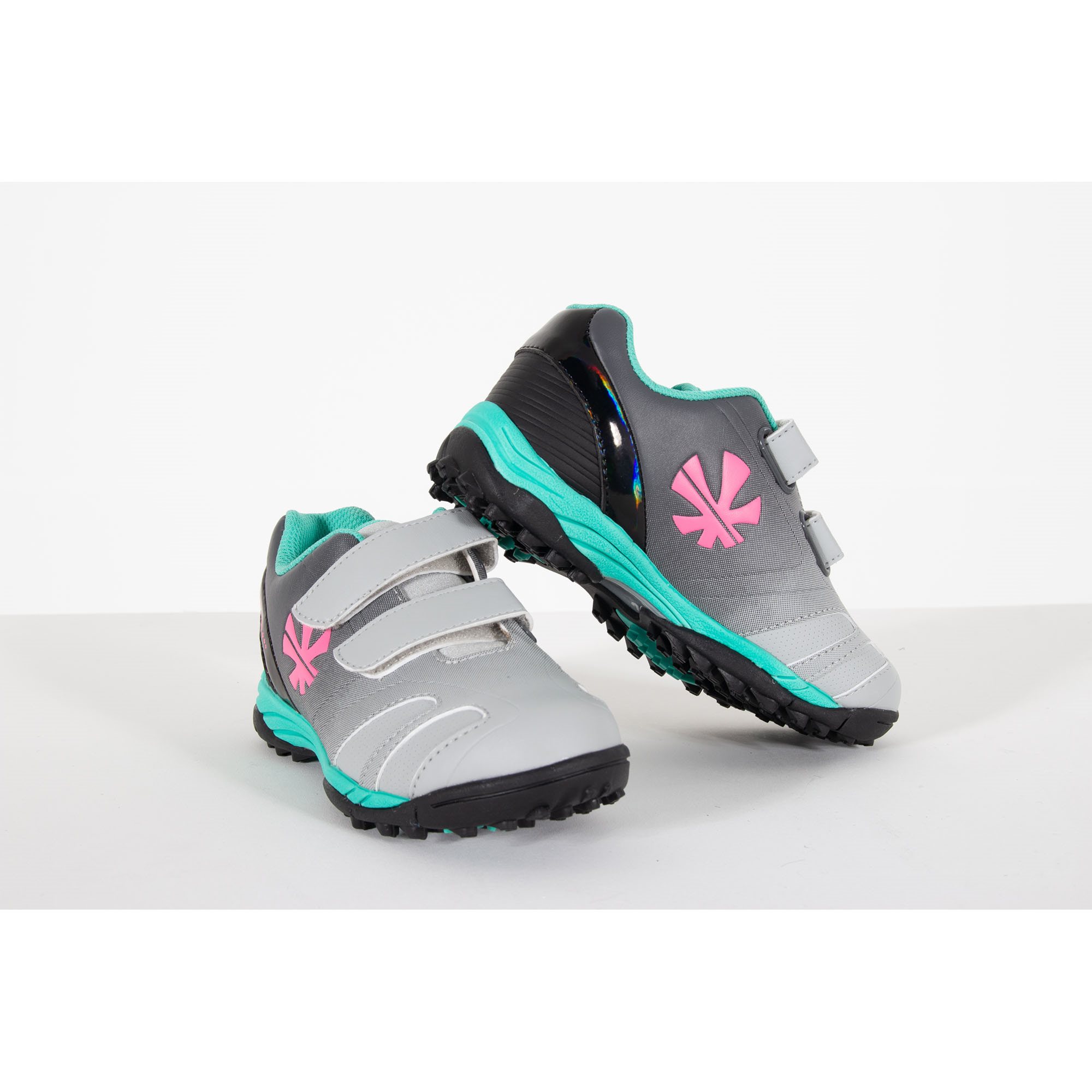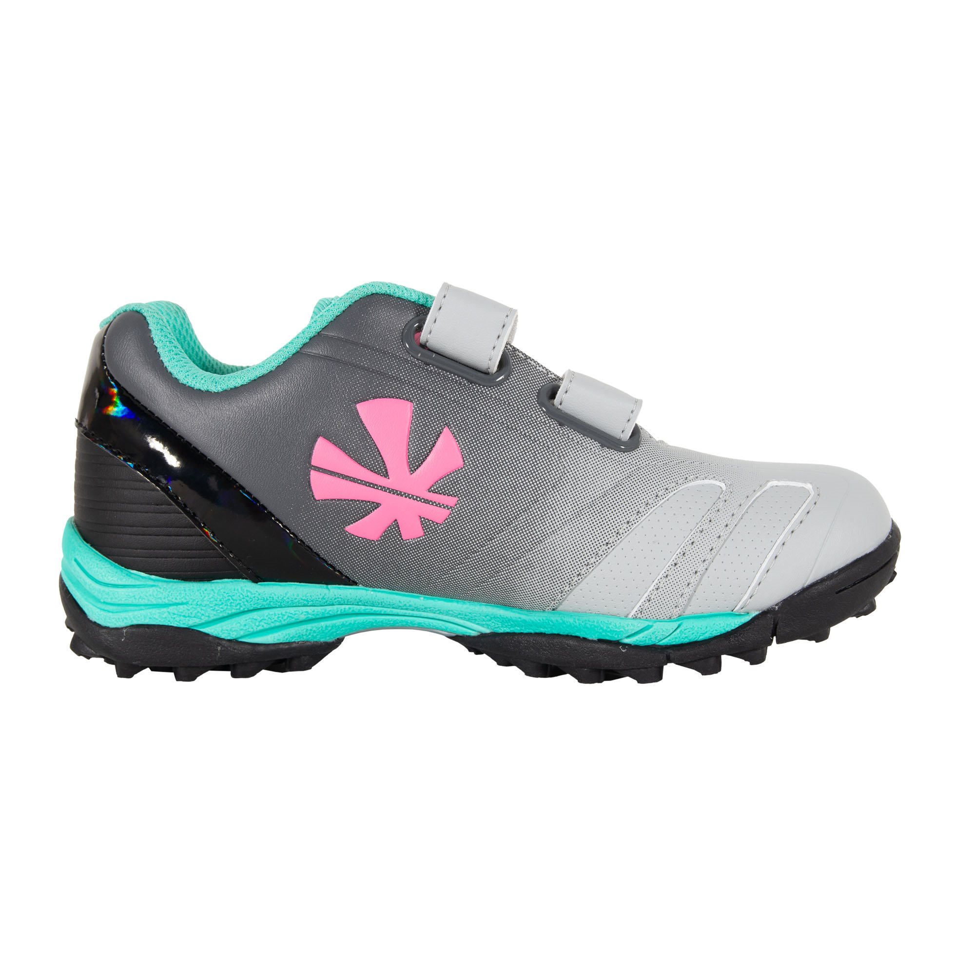 Deze outdoor hockeyschoen voor junioren biedt optimale grip dankzij de slijtvaste noppenzool. De noppen zijn zodanig geplaatst dat het maximale grip levert in alle richtingen en de druk op de voet optimaal verdeelt. De schoen biedt uitstekende demping dankzij de lichtgewicht, extra schokreducerende binnenzool. Het stevige maar ademende bovenwerk voelt zacht aan en biedt goede ondersteuning aan de kindervoet. Maat 28 tot en met 35 is de schoen voorzien van een klittenbandsluiting en vanaf maat 36 met vetersluiting.