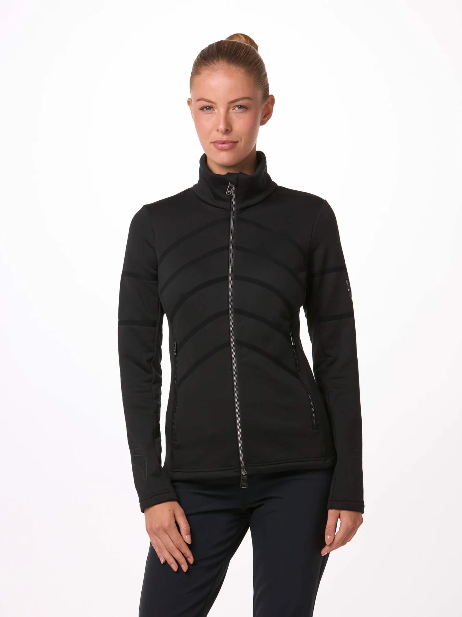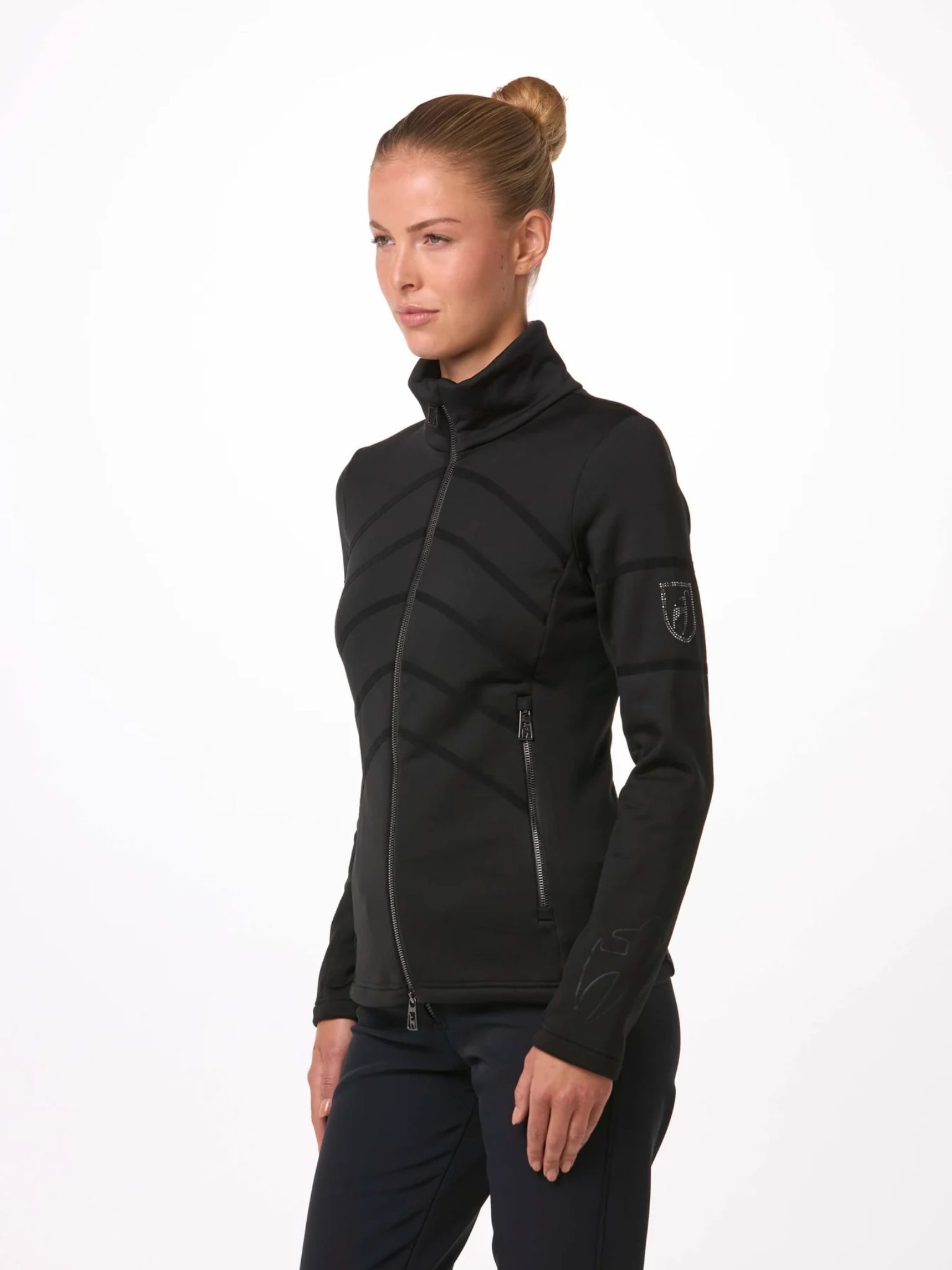 Een stijlvolle look voor op de skipiste of de golfbaan. Het SUE tussenlaagjack combineert technische details met een luxe logo van Swarovski®-kristallen op de mouw. Gemaakt voor actieve momenten, houdt de SUE je warm en droog. 100% temperatuurregulatie.